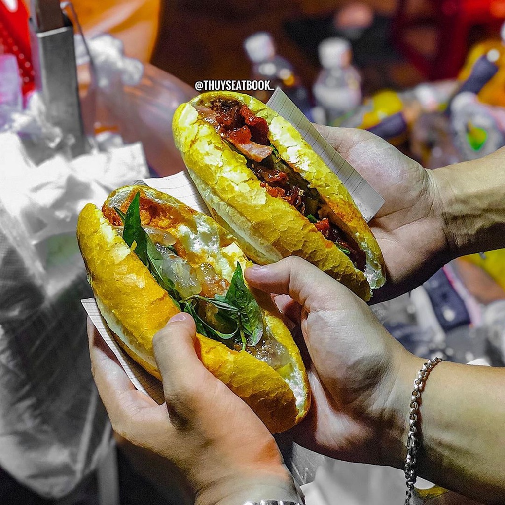 Một trong những tụ điểm ăn uống tập trung đông đúc thực khách phải kể đến quán bánh mì sát bưu điện thành phố. Tại đây, mỗi chiếc bánh bao gồm nhiều loại topping lạ miệng, đầy đặn như bột lọc, xá xíu, nem chua... Trước đó, món ăn này được biết đến với tên gọi “bánh mì chân cầu" bởi từng bán và làm nên thương hiệu dưới cây cầu Trường Tiền nổi tiếng, mở đến khoảng 2-3 giờ sáng,
