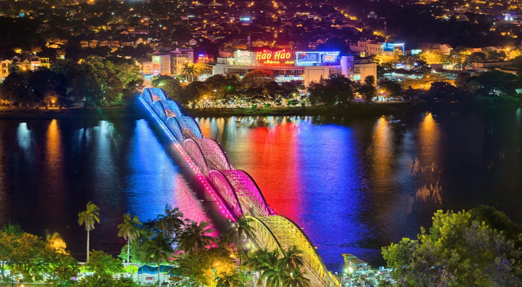 Khi màn đêm buông xuống, cầu Trường Tiền trở nên lộng lẫy hơn bao giờ hết bởi hệ thống đèn LED nhiều màu sắc. Nếu muốn cảm nhận trọn vẹn nhịp sống thành phố vào ban đêm, đi bộ là cách tốt nhất để có thể thưởng ngoạn vẻ đẹp ở đây.