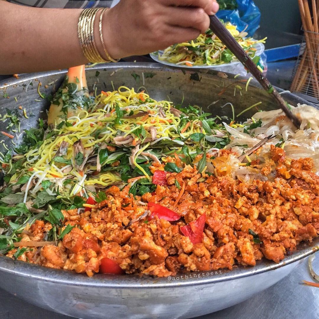Đúng như tên gọi, bún trộn ra đời nhờ trộn các nguyên liệu với nhau bao gồm cà rốt, nấm mèo, khuôn đậu, bánh tráng, rau thơm, đậu phộng... Nếu không kết hợp cùng mắm nêm hay nước mắm chua ngọt, đây có thể được xem là "món chay" đáng thử của ẩm thực Huế. Vì người Huế ăn rất cay, món bún trộn cũng không thể thiếu tương ớt hay sa tế ăn kèm để đúng vị. Bạn có thể tìm thấy món ăn này tại các khu ẩm thực ở Huế. Ảnh: Builengoctran, thaoci.90.