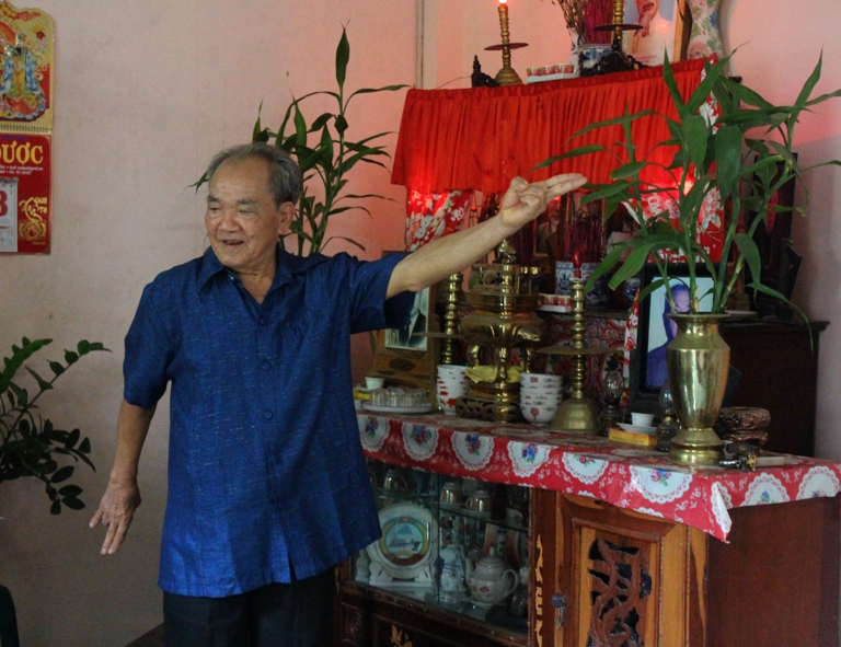 Nghệ nhân Hồ Hữu Có đang minh họa động tác “chỉ” trong nghệ thuật tuồng Huế