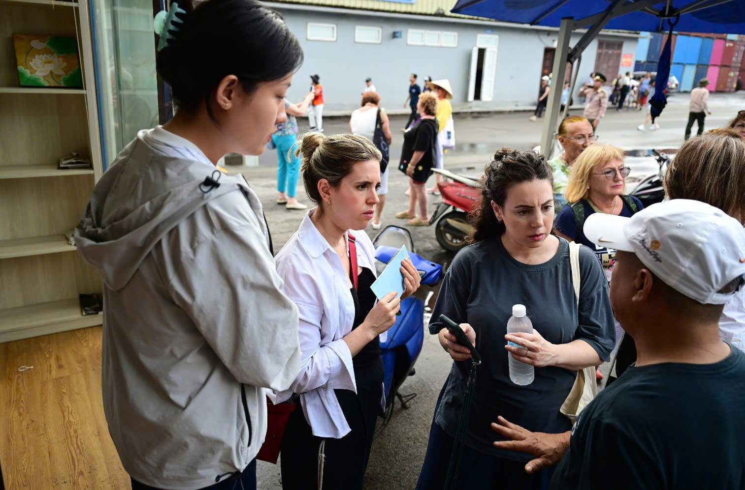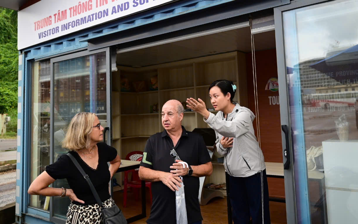 Cán bộ Trung tâm thông tin xúc tiến du lịch Huế đang giới thiệu và hướng dẫn cho du khách quốc tế vừa xuống tàu