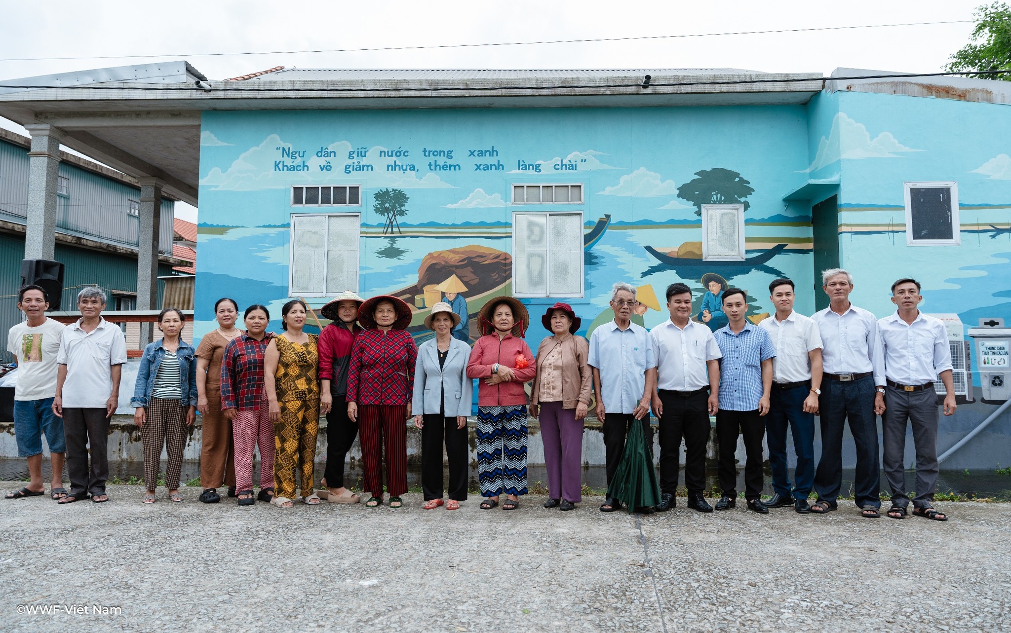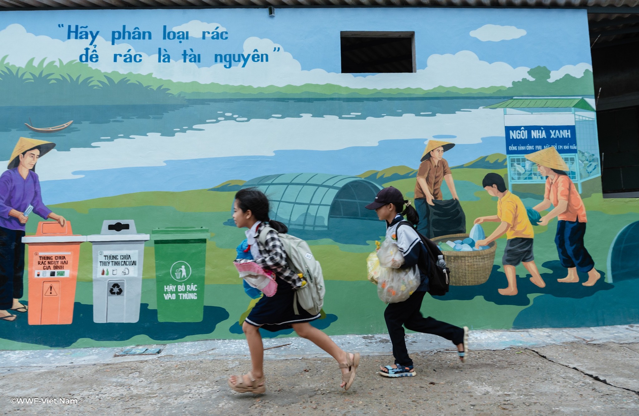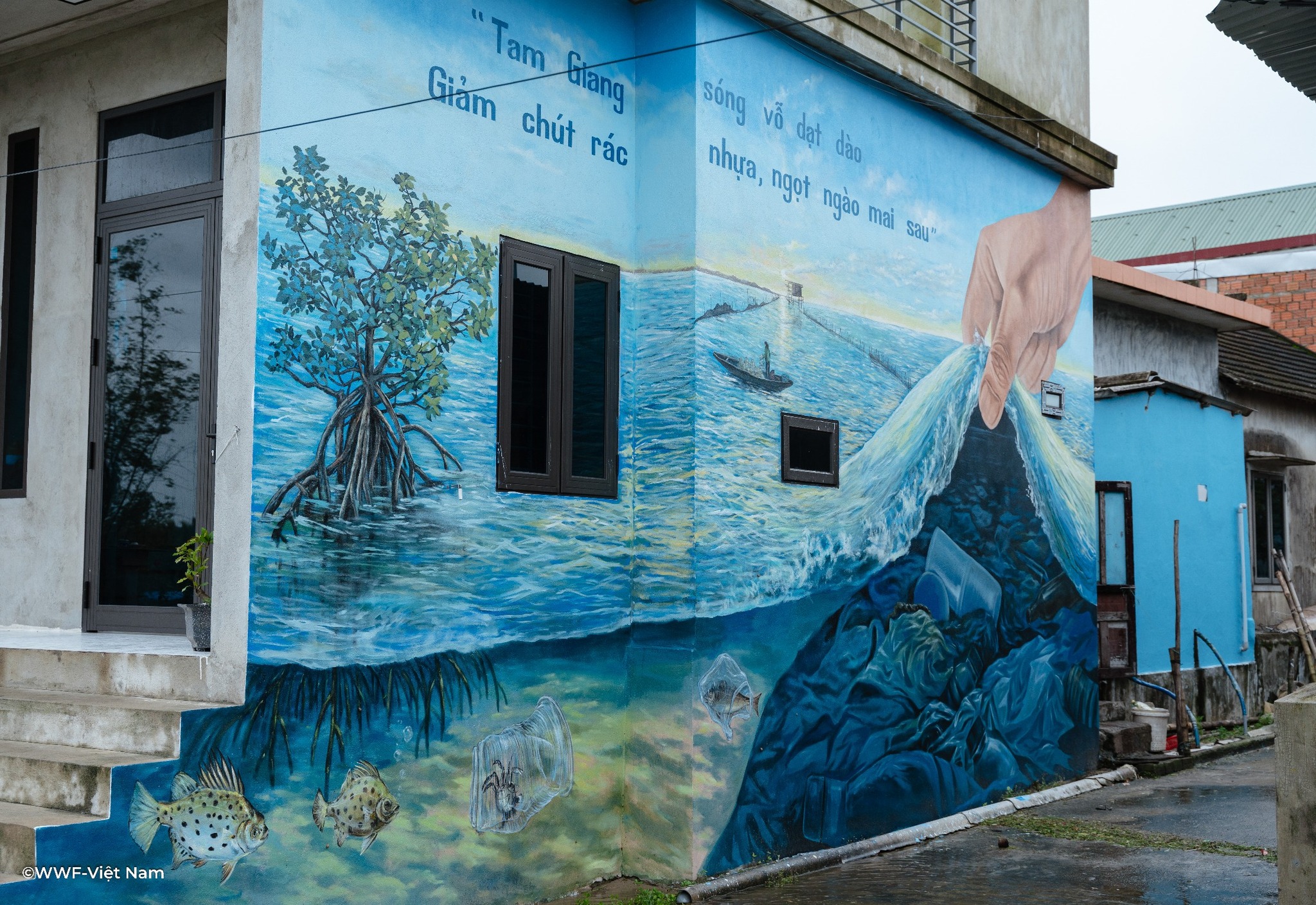 Các mảng tường cũ kỹ nay được phủ lên sắc màu tươi sáng: xanh lam của sóng nước, vàng cam của bình minh, cùng hình ảnh người dân thu gom rác nhựa, trẻ em vui chơi bên biển sạch. Mỗi bức tranh là một lời nhắn nhủ nhẹ nhàng nhưng sâu sắc – rằng giữ gìn môi trường chính là giữ lấy tương lai.
