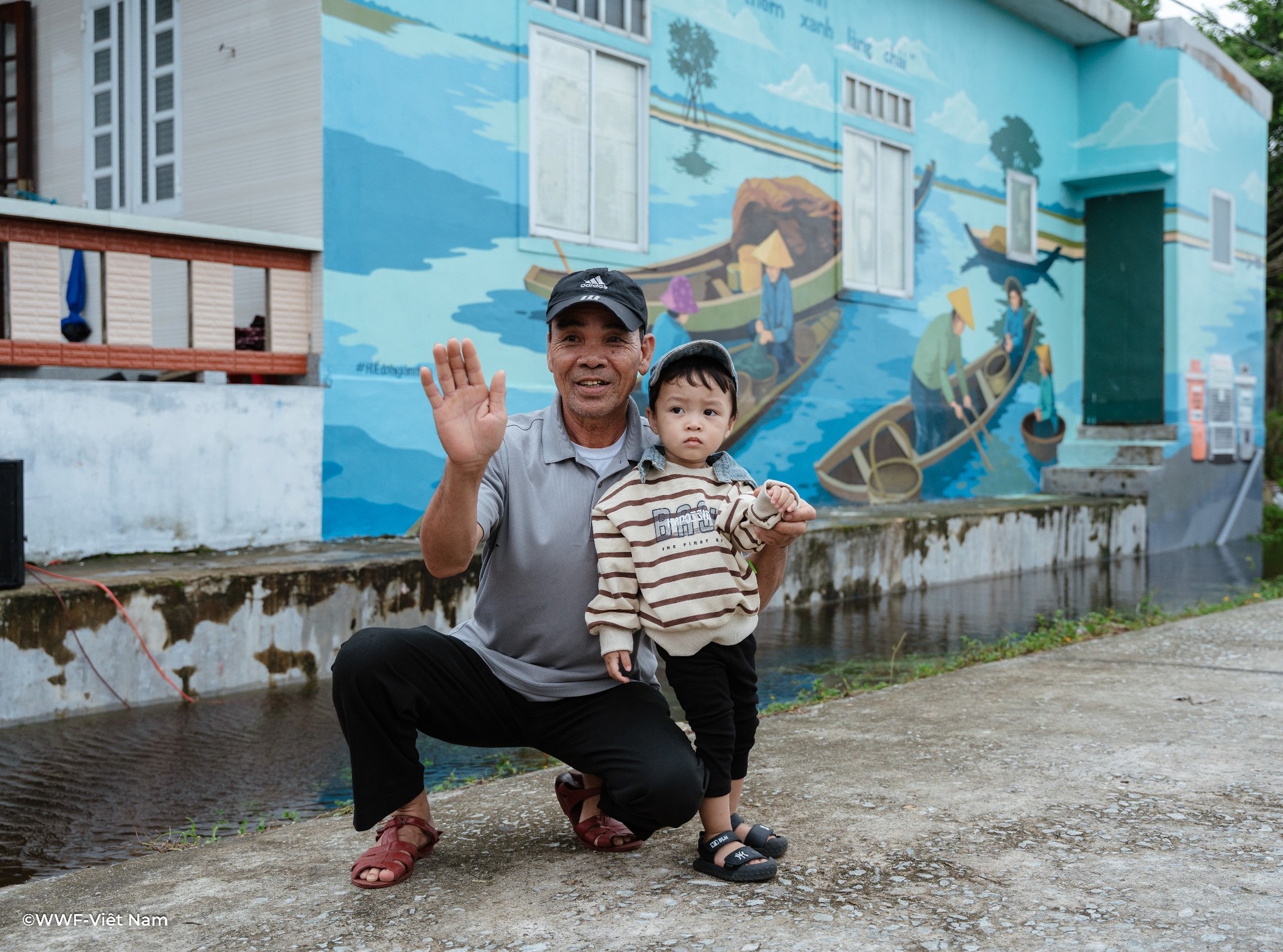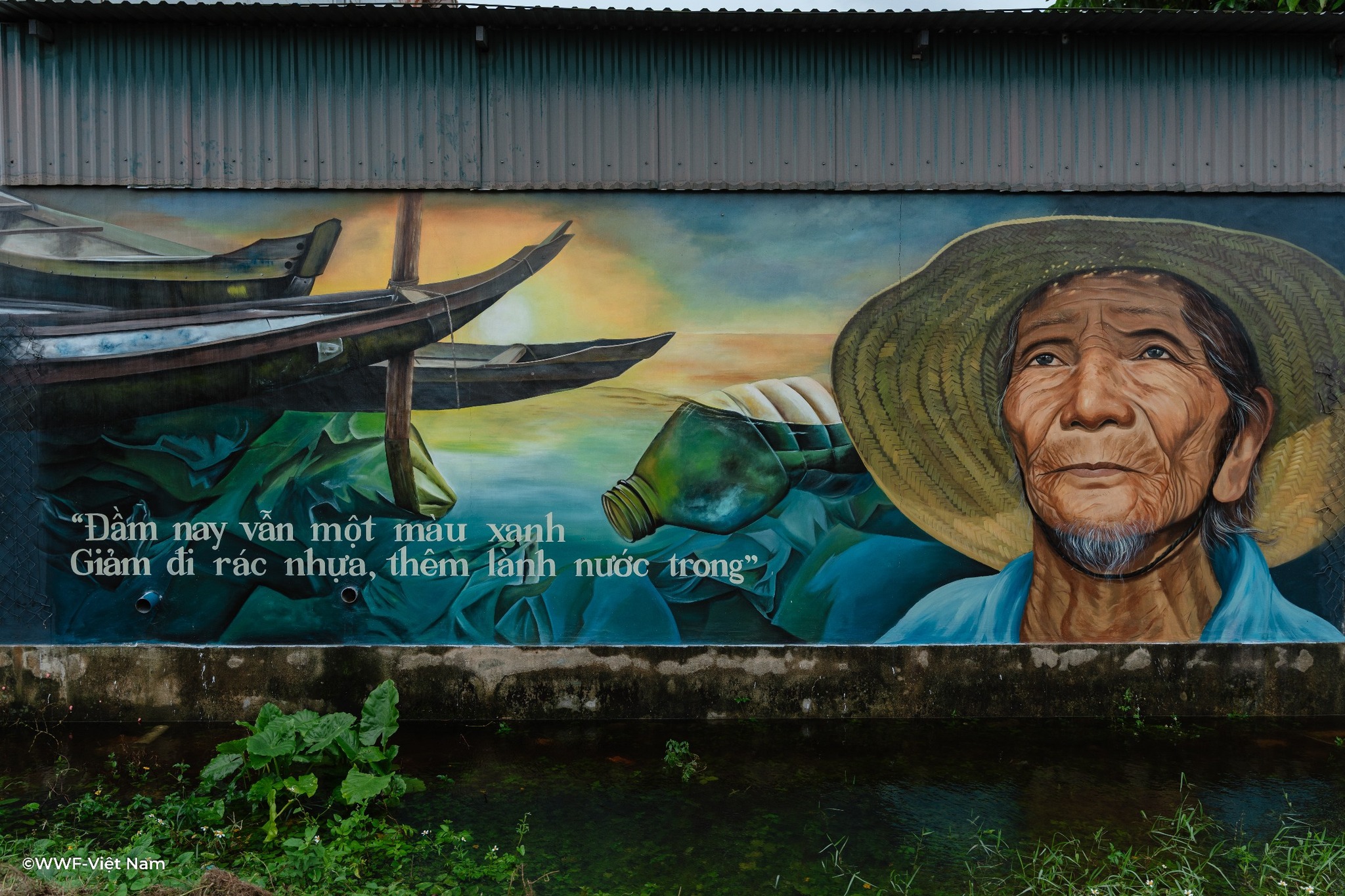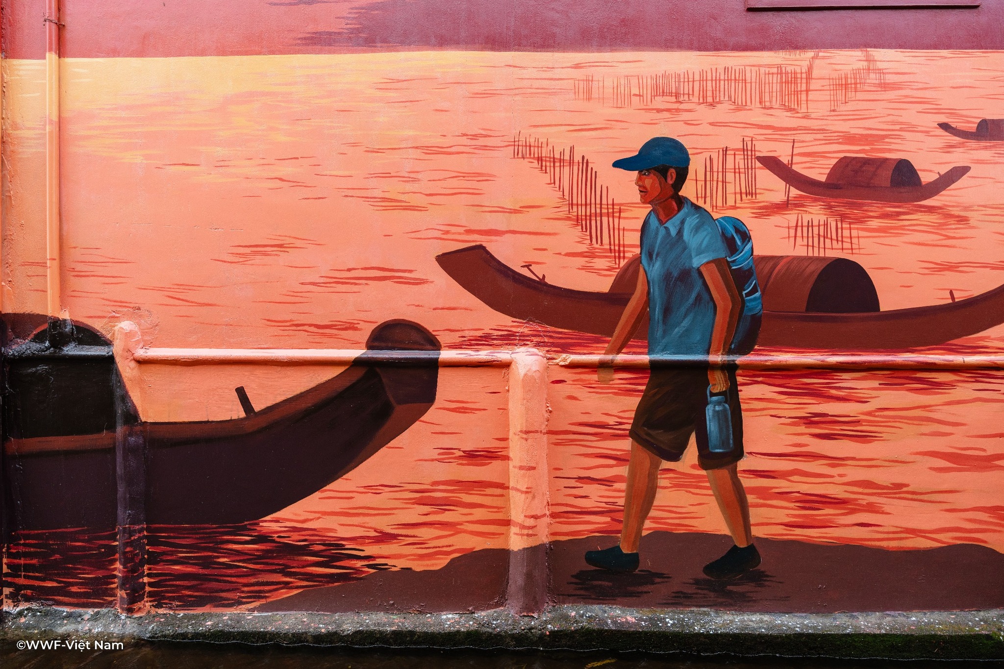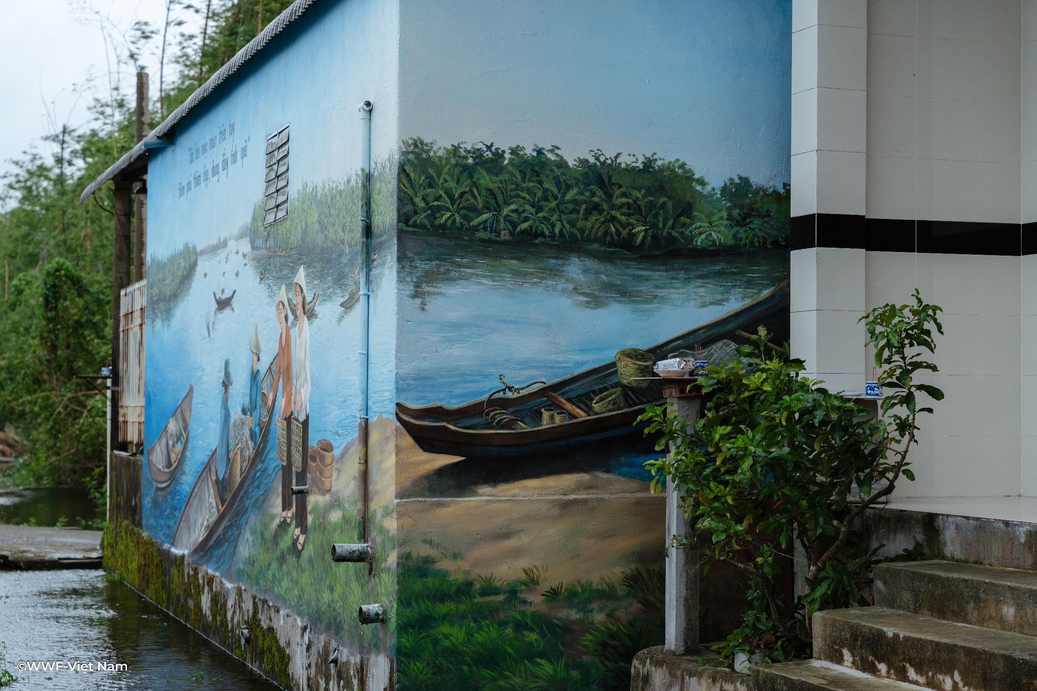 Các mảng tường cũ kỹ nay được phủ lên sắc màu tươi sáng: xanh lam của sóng nước, vàng cam của bình minh, cùng hình ảnh người dân thu gom rác nhựa, trẻ em vui chơi bên biển sạch. Mỗi bức tranh là một lời nhắn nhủ nhẹ nhàng nhưng sâu sắc – rằng giữ gìn môi trường chính là giữ lấy tương lai.