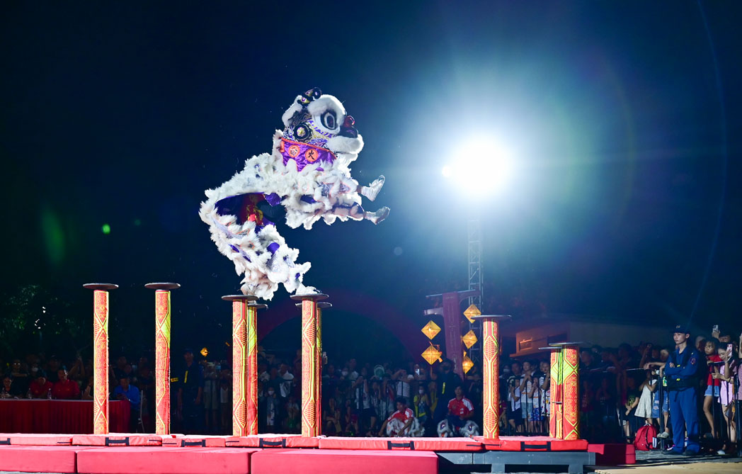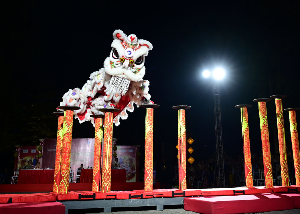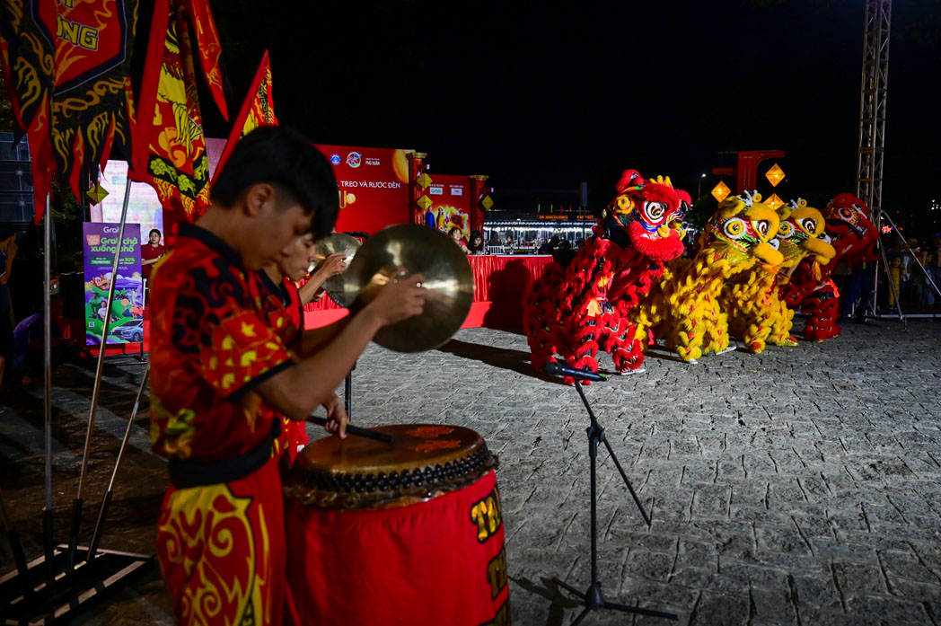 Sau workshop, khu vực check-in tại công viên trở thành “biển sáng” khi hàng trăm chiếc đèn lồng được thắp lên, soi chiếu nụ cười rạng rỡ của thiếu nhi và du khách. Từ 18h30, sân khấu chính bùng nổ với màn giao lưu múa Lân, nơi những đoàn lân tiêu biểu của thành phố phô diễn sự mạnh mẽ, dũng mãnh trong từng thế võ, từng nhịp trống. Những màn nhào lộn, leo cột, tung hứng đã tạo nên bầu không khí náo nhiệt, thu hút đông đảo khán giả.