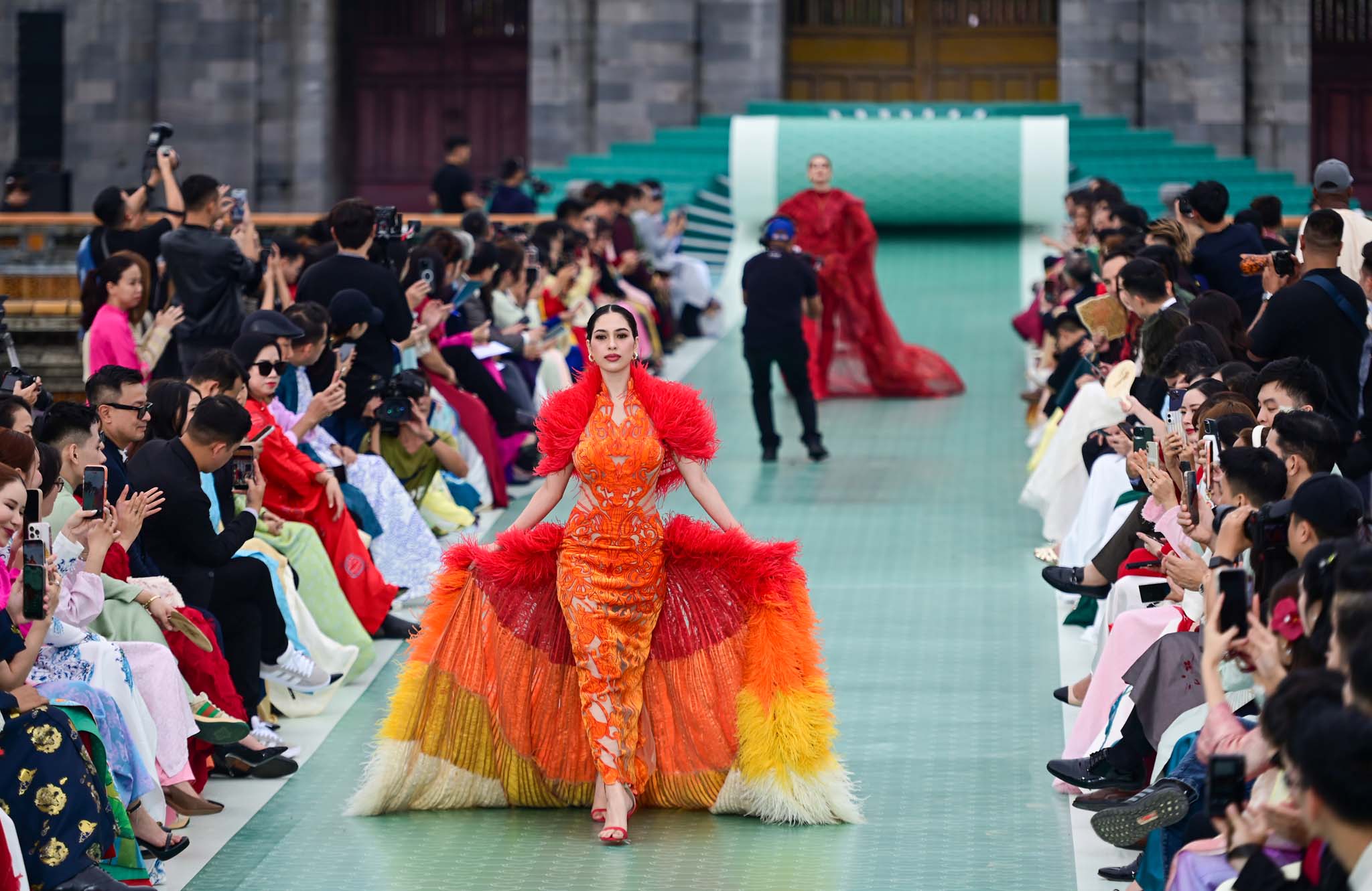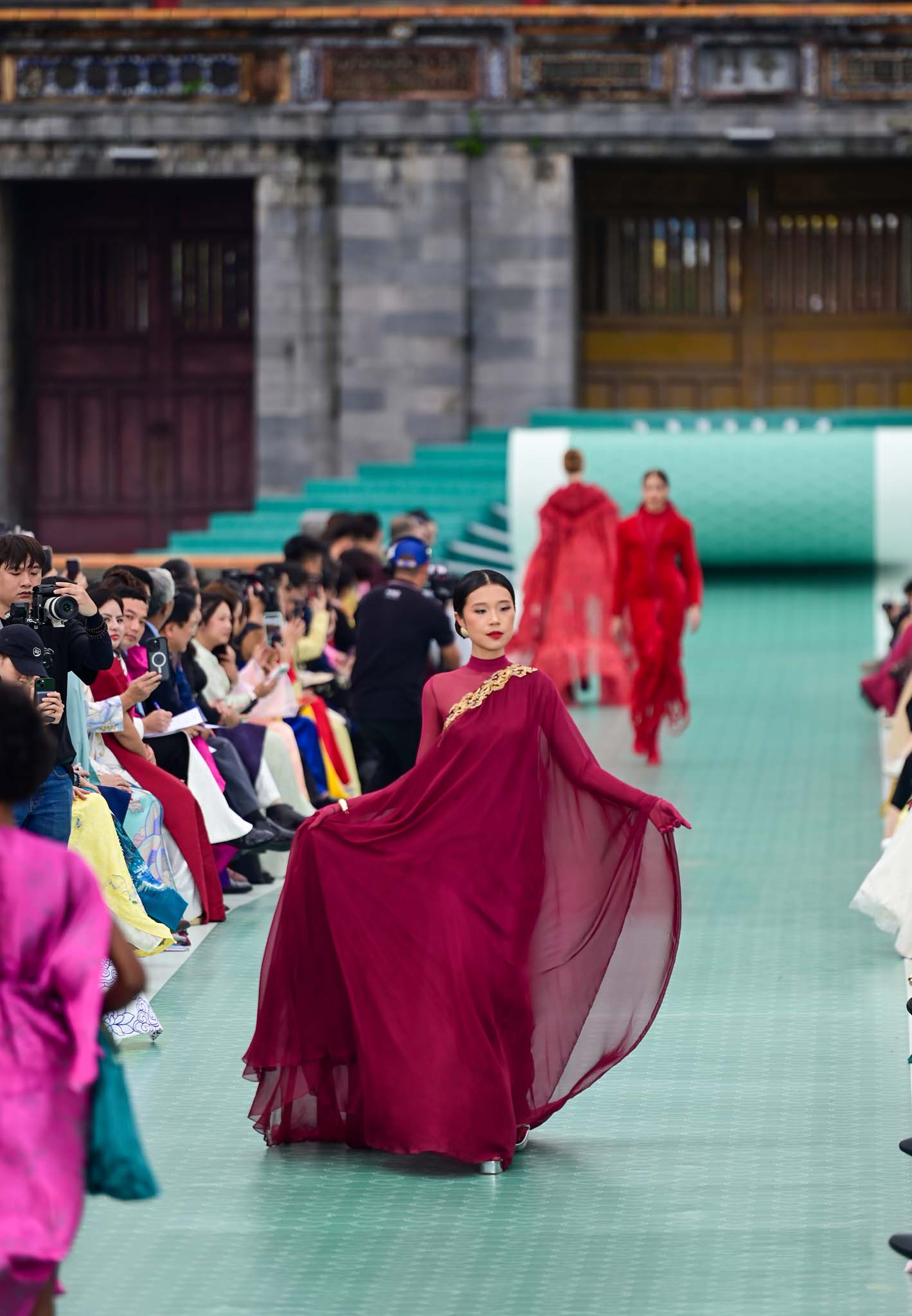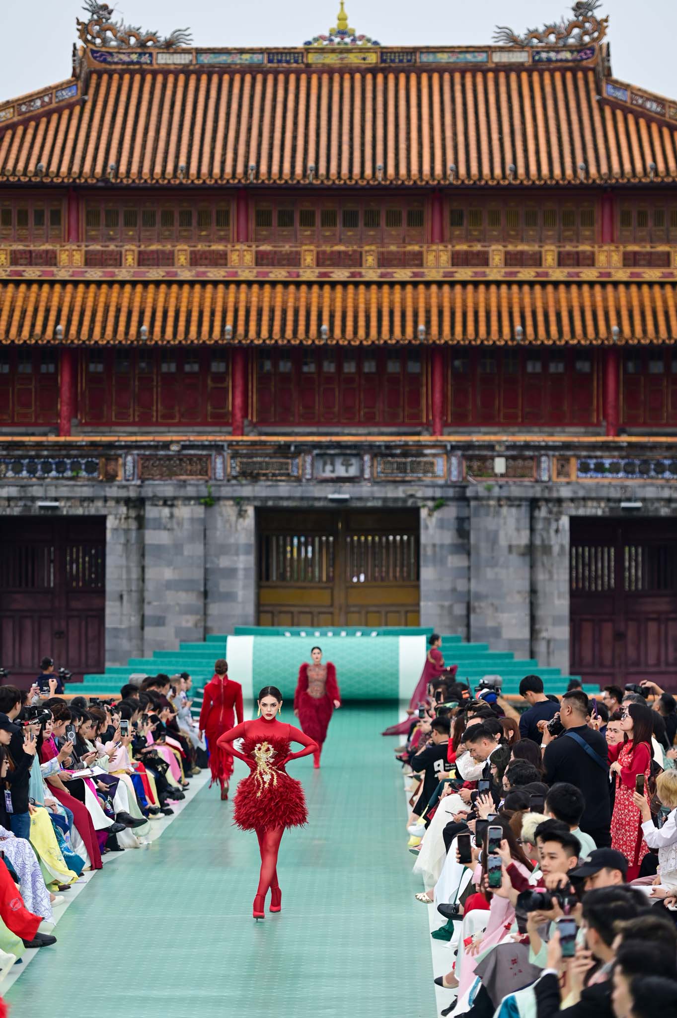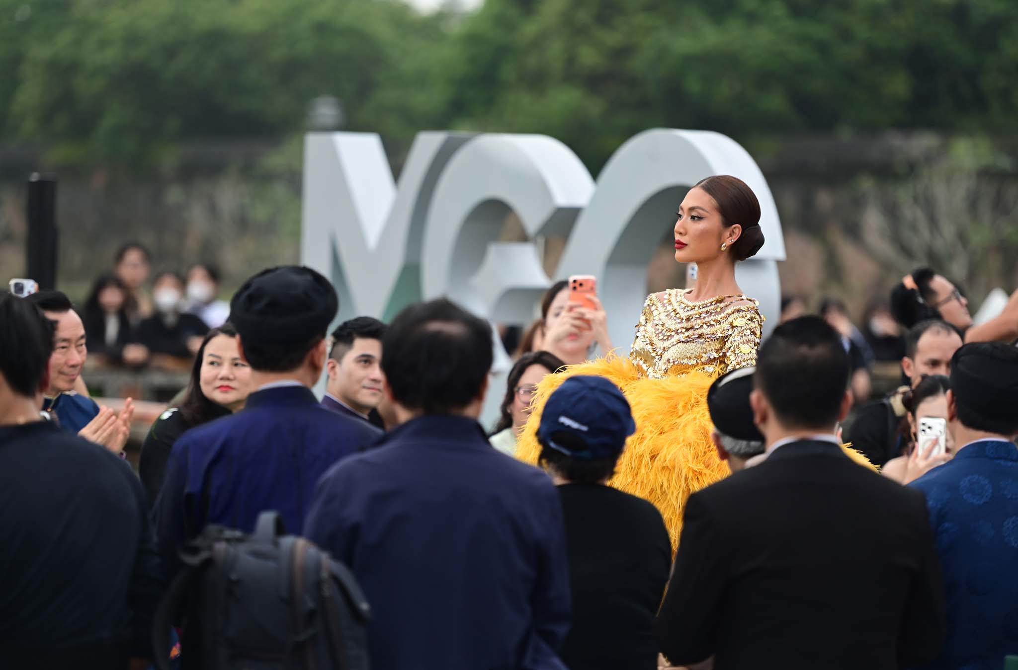 Sàn diễn được thiết kế đặt đúng trên trục hoàng đạo, bắc qua đôi hồ nước trước Ngọ Môn, tái hiện hành trình qua các lớp không gian phong thủy: Đất - Nước - Di sản - Con người. Từ lối dẫn dài vươn thẳng đến Cửa Ngọ Môn, mọi chuyển động của người mẫu đều trở thành một cuộc đối thoại giữa thời trang đương đại và giá trị cung đình truyền thống. Đây không chỉ là một sàn runway, mà còn là một hành trình, nơi mỗi bước chân đều mang theo di sản Việt Nam vươn ra thế giới.