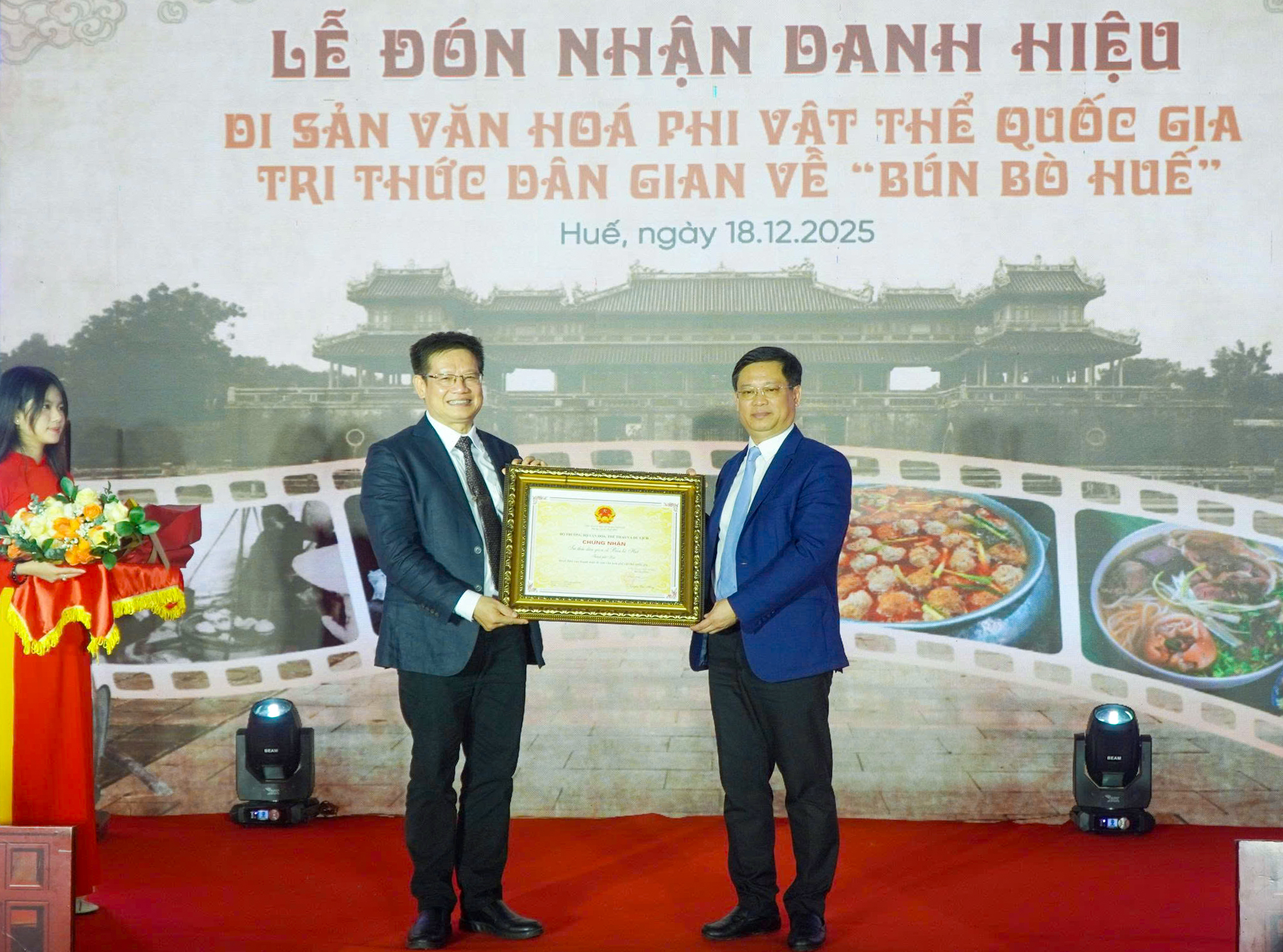 Dịp này, thừa uỷ quyền của Bộ Văn hoá, Thể thao và Du lịch, lãnh đạo thành phố Huế đã trao chứng nhận Danh hiệu Di sản Văn hoá phi vật thể Quốc gia Tri thức nhân gian về “Bún Bò Huế”