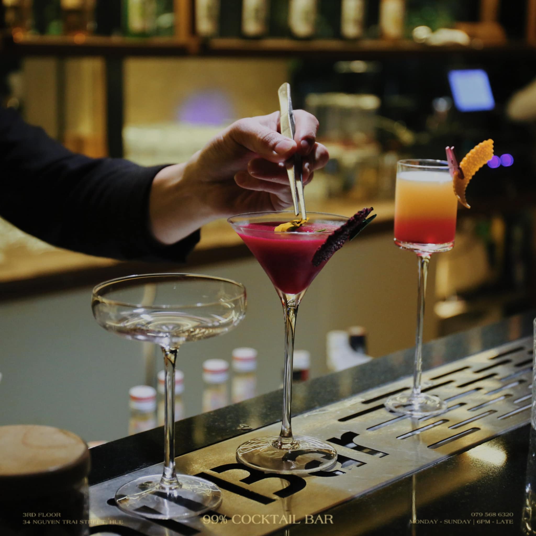 Vào mỗi tối từ thứ Hai đến thứ Năm, 99% Cocktail có chương trình Happy Hour từ 18h00 đến 19h30 với nhiều ưu đãi hấp dẫn để khởi động một buổi tối nhẹ nhàng cùng bạn bè. Đặc biệt, vào tối Thứ Năm hàng tuần, chương trình Date Night từ 19h30 đến 22h00 là khoảng thời gian lý tưởng cho các cặp đôi: tặng ngay 2 ly custom shots miễn phí, giảm 10% trên tổng hóa đơn và lưu giữ khoảnh khắc ngọt ngào với 1 ảnh polaroid kỷ niệm xinh xắn. Một chút ưu đãi, một chút lãng mạn đủ để làm nên một buổi hẹn hò đáng nhớ giữa lòng thành phố Huế mộng mơ.